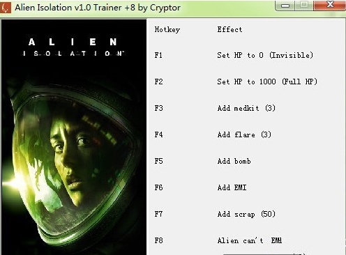 异形:隔离八项修改器Cryptor功能还是挺多的,而且个个都很实用,小编非常推荐各位用一下这个修改器,主要是异形:隔离这游戏玩起来太蛋疼了。