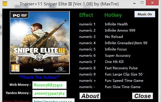 狙击精英3v1.08十一项修改器专门用于修改狙击精英3的数据,比如一击必杀,子弹无限,体力无限,无限憋气,总之可以让主角非常牛逼,建议少用。