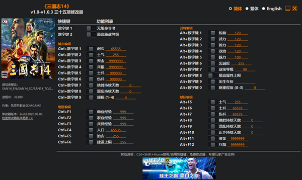 三国志14修改器3dm是由风灵月影根据玩家需求制作的游戏修改补丁,支持v1.0.3版内容修改,为玩家提供了无限命令书、更改经验、人口、天数等三十五项修改功能,开启三足鼎立的庞大帝国事业。