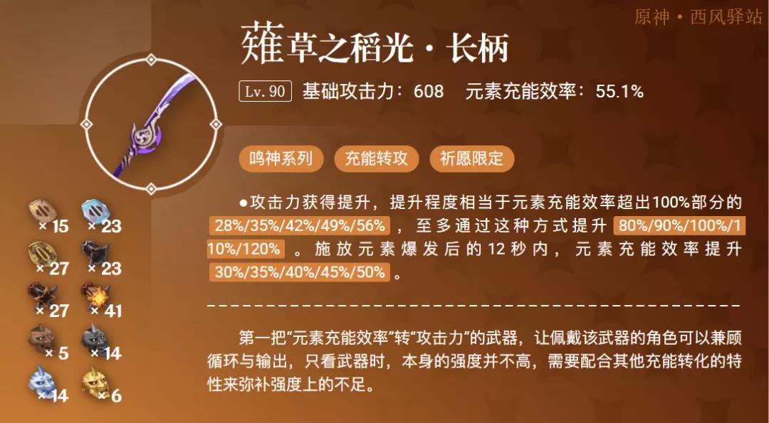 和雷电将军「固有天赋二」还有绝缘四件套类似,属于对元素充能效率的二次利用,单独看此武器的转化率: