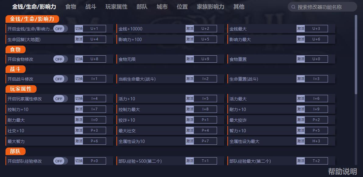 2.开启金钱/生命/影响力修改(大地图):在大地图暂停游戏(1)使用。