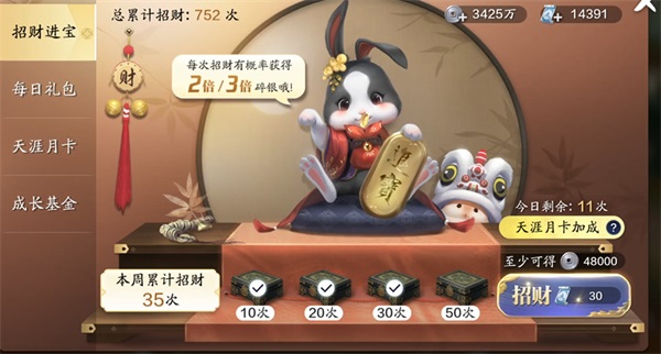 招财进宝建议所有少侠点满每天的5次,拿到30次的奖励。如果绑银非常稀缺,那么每天点7次,有一天8次拿满50次奖励。