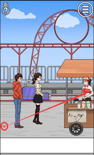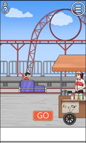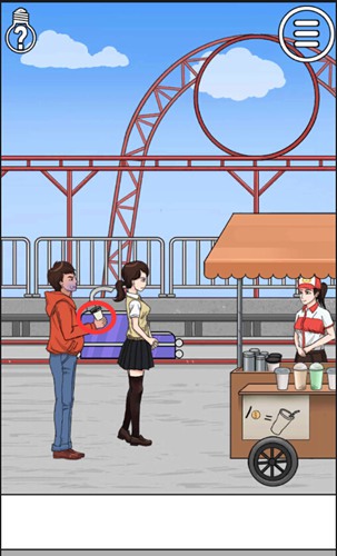 捡起硬币给店员,得到饮料;把饮料给男生喝了后,点击乘坐过山车,把防护措施放下来后,点击GO。