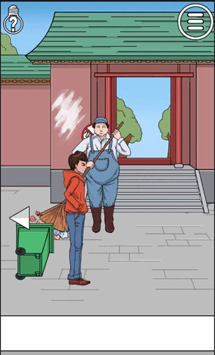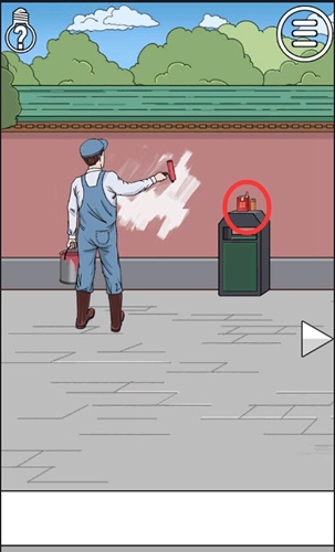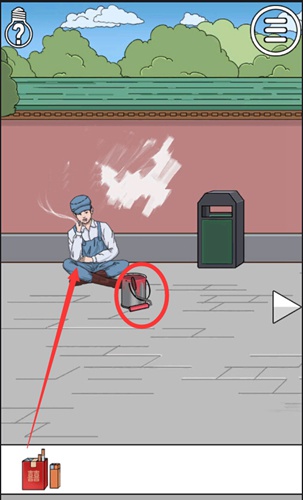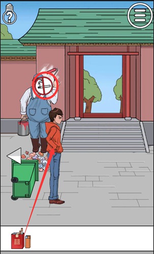 先把垃圾箱弄倒了,大妈会过来清理,去左边点击得到香烟,给大叔香烟,得到油漆桶,返回把油漆桶给大妈,她会转身出现禁烟标记,把烟给男主抽引来警察带走。