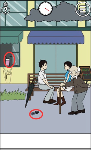 把地上的盖子打开,老头拐杖掉孔里后会拿走雨伞;打开窗户得到饮料,把饮料给情侣,得到后面的衣服,下雨后他们就没有遮蔽物了。