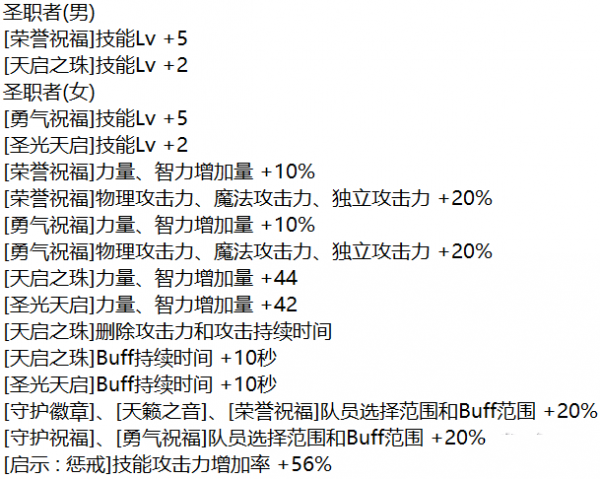 第一种荣誉、勇气祝福、禁断的诅咒 物理攻击力增加量+4%守护恩赐 体力精神+164启示圣歌,提线木偶 智力+151第二种60-80+1荣誉、勇气祝福、禁断的诅咒 物理攻击力增加量+4%守护恩赐 体力精神+154启示圣歌,提线木偶 智力+131,第三种1~30 技能冷却时间-15%荣誉、勇气祝福、禁断的诅咒 物理攻击力增加量+4%守护恩赐 体力精神+144圣歌+131,提线木偶智力+116