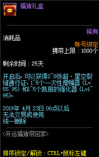 开启后,可以获得2~8张超·星空裂缝通行证、1~5个一次性增幅器(Lv55~95)和1~5个凯丽的强化器(Lv1~95)。