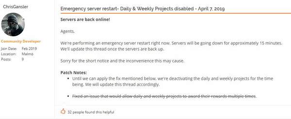 “我们目前无法通过简单的服务器重启来解决这个问题,因此我们从现在起禁用了游戏中的日常以及周常任务。”“我们会尽可能快的找到解决方法,一旦有所进展会立即公布,感谢特工们的耐心等待。”