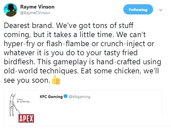 显然面对肯德基的调侃,重生娱乐的员工也没有坐以待毙,而是进行了回怼。《Apex英雄》开发者之一Rayme Vinson就发表了推特回怼了肯德基的调侃。