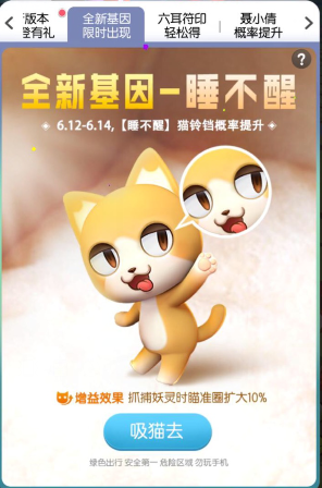 睡不醒是最新出的猫基因,拥有超萌的外形,极品的属性,增益效果是抓捕妖灵时瞄准圈扩大10%,活动时间6.12-6.14日。