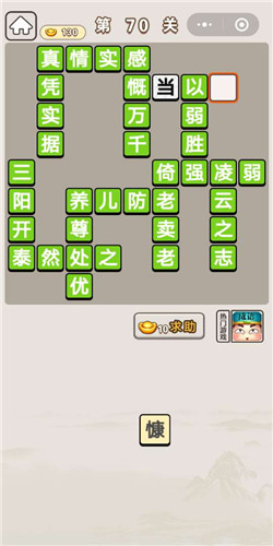 成语宫廷记第70关的答案小编也已经为大家准备好啦,还不清楚的小伙伴们来看看吧!通关答案1、真凭实据2、真情实感3、感慨万千4、慨当以慷5