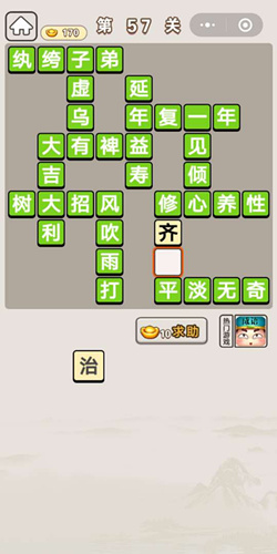 成语宫廷记中很多成语都是会重复出现的。比如在第57关我们将要碰到的修齐治平(修身齐家治国平天下),在之前的关卡中,我们就已经碰到过几