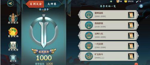 最基础的奖励是只要参与一局名剑大会就会获得名剑币,获胜的一方还会加个人的竞技分。然后每周获得5场竞技场胜利后,可在下周一获得周结算奖励,段位越高,奖励越好。然后每赛季累积参与竞技场10次以上的玩家,可在赛季结束时获得以该赛季最高段位为标准的赛季结算奖励。不仅如此,当竞技分数达到一定分段还会解锁一些外观购买资格,到达2400后可以进入大师赛。