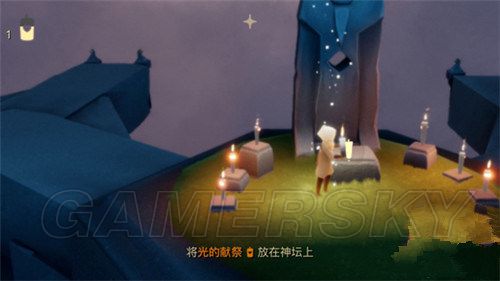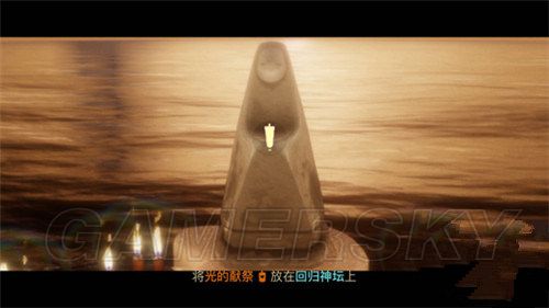 这时系统提示我们创造一个蜡烛,“游戏内称之为光的献祭”,按照提示把蜡烛放在雕像上,系统称之为“回归神坛”。
