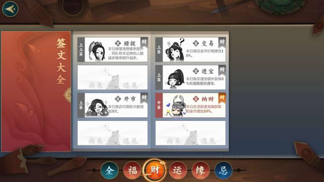 在进入游戏后,大家可以看下任务的那里会有一个抽签的按键。抽签作为华夏玄学的代表性活动,在现实中可以测试自己的运势“信则有,不信则无”。那么在指尖江湖中求签同样也是有着测试自身运气的成分,玩家在进入游戏后,策划大大会给予一支幸运签,拥有三个宜相和一个忌相,而玩家们求签的过程也是非常的具有喜感。
