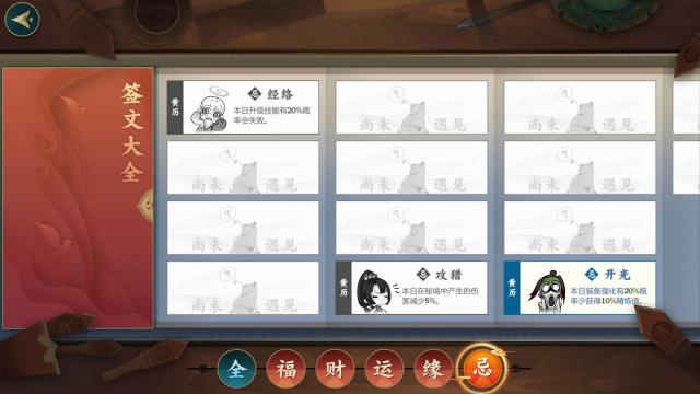 当然既然有上上签也会有普通的签,甚至是负buff的签出现,游戏里称为忌相,忌相的出现就比较让人难受了,比如说玩家在升级技能时会有20%的失败,降低输出和降低防御也是常有的事。所以求签需谨慎,运势有风险啊。