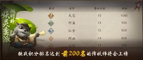 每个周期会根据降妖师大人的积分进行排名,积分相同时委派次数少(不计算普通委派次数)的降妖师排名靠前,前200名的降妖师将会上榜。