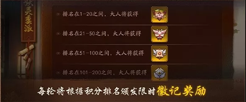 每周期结算时会根据排名给上榜的降妖师发放限时徽记奖励,并清空积分。限时徽记持续4天,从发放时开始计算时间。