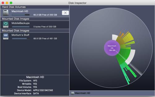 Disk Inspector能检测到在Mac OS X之间的文件。通过一个高度视觉化的用户界面,这款软件通过图表将硬盘中存储的所有文件都呈现出来,无论是照片还是PDF等等。在点击了开始按钮之后,它将会运行大概1分钟的时间,然后通过雷达表盘的方式将Mac存储空间的细节酷酷的展现出来。