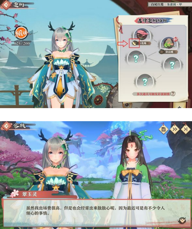 比如说青林第5次出游万花坳遇到的还是翠玉灵,但是翠玉灵的两个选项我都选过了,所以下图小花瓣就不会亮起第4片。