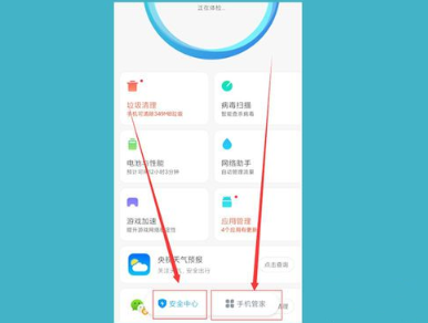 进入之后可以看到,我们现在目前是处于【安全中心】的选项中,下面我们选择【手机管家】,并点击