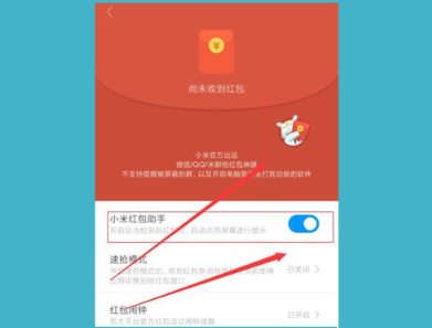 在【红包助手】选项中打开【小米红包助手】的开关,打开这个开关之后才能进行红包助手的设置