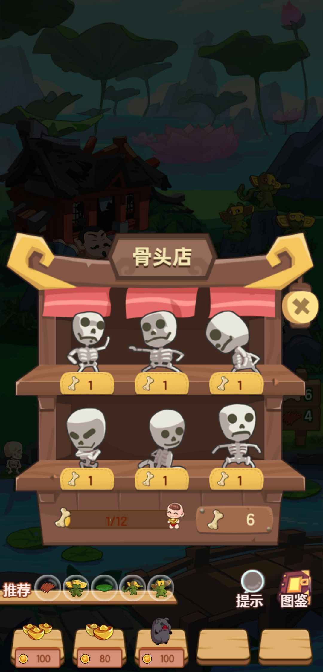 玩法说明:哪吒前面的荷塘上的荷叶有财神爷、骷髅、小人儿、猪,每关哪吒会有3次套圈的机会,可以根据你想要的道具去套对应的道具。道具产出:财神爷出元宝;骷髅出骨头;猪出猪皮;小人儿随机出骨头、猪皮、元宝。