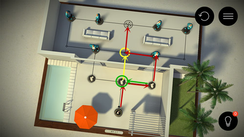 零杀敌通关,需要玩家用石块吸引走所有的敌人。中间石块投掷到黄色圈位置,右边石块投掷到粉色圈位置,移动到左边将石块投掷到绿色圈位置。然后就可以直接走到终点。