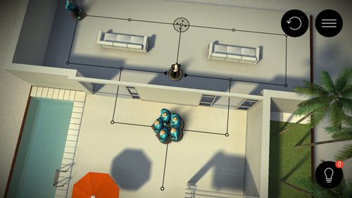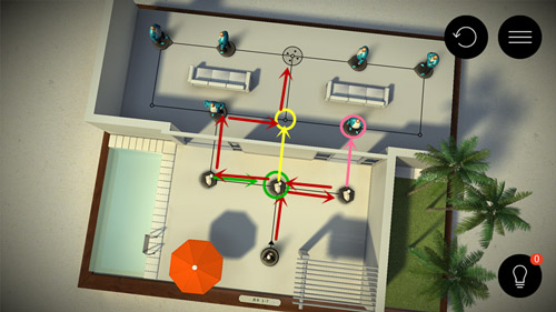 先走到第一步,将石块投掷到黄色圈圈的位置,然后再向右移动,将石块投掷到绿色圈圈的位置,引开所有的敌人后你就可以继续顺着红色箭头走向终点。