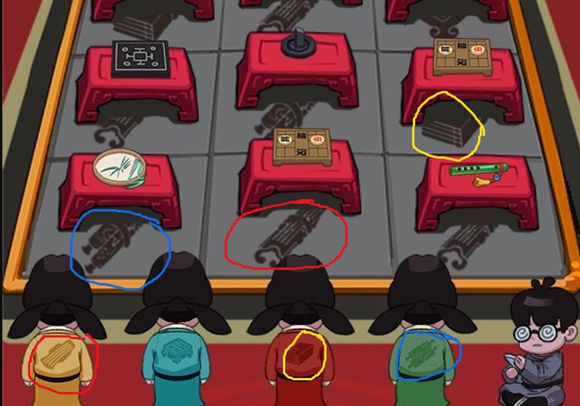 玩法说明:基本和琴棋书画一样,不过需要注意4个角落对应琴棋书画(桌上、桌下要一样),中间站书童,然后点掉右侧的牌子,然后点左侧的锣鼓。就能出道具了。