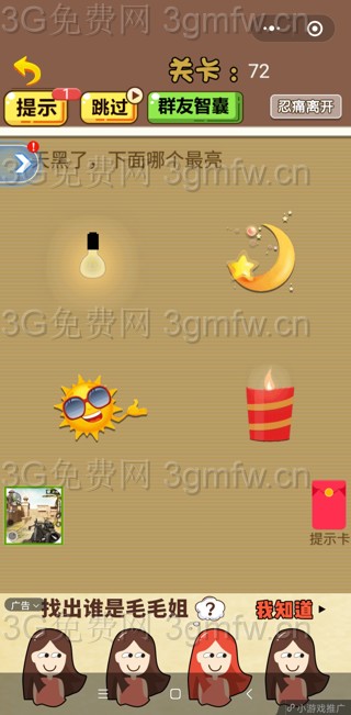 天黑了下面哪个最亮是微信小程序《脑洞2020》第72关的问题,很多网友不知道答案是什么,下面小编给大家带来微信小游戏脑洞2020第72关攻略。