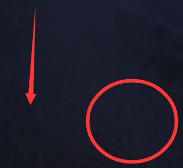 ①正常鱼群点:如下俩张图,开低配之后的,上帝视角基本看不见鱼群,但是可以看见鱼群下的9个点,这也是下杆的基础,因为水深的原因,鱼群经常跑偏。在箭头处,也就是9个点中间下杆!