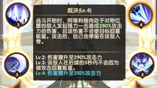 战斗开始时,阿塔利娅向对位敌人发起强力一击造成310%攻击力的伤害,该敌人在后续5秒内不会因为被攻击恢复能量,攻击后自己会停留在敌人旁边。相当先手的技能,除了女仆罗莎琳等少数角色能躲开之外,能先手控绝大多数的敌人,对脆皮后排造成的杀伤也是一流的。天罚的招牌技能。