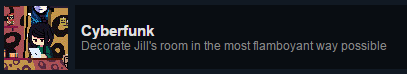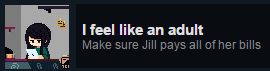 达成方法:购买Pc-9x和AssortedCartridges这两样道具,然后点击家里的Pc-9x(注:只有在带Dana回家并喝酒之后才可以完成)(译注:在阳台上喝酒时狂点Drink灌醉Jill可以看到谜之对话)