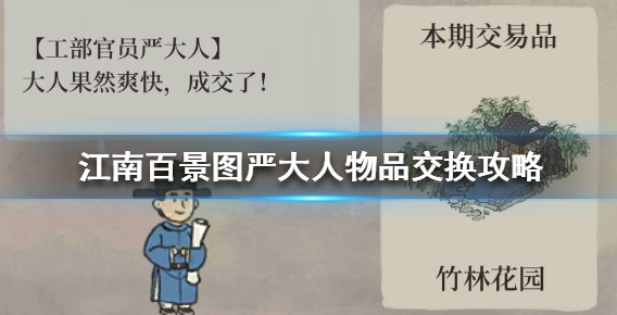 江南百景图严大人要换什么?江南百景图里大家在后面会遇到工部官员严大人,不少玩家也都戏称他为贪官,因为给他啥他都瞧不上,那么严大人到底要换什么呢,下面就跟小编来一起看看吧。