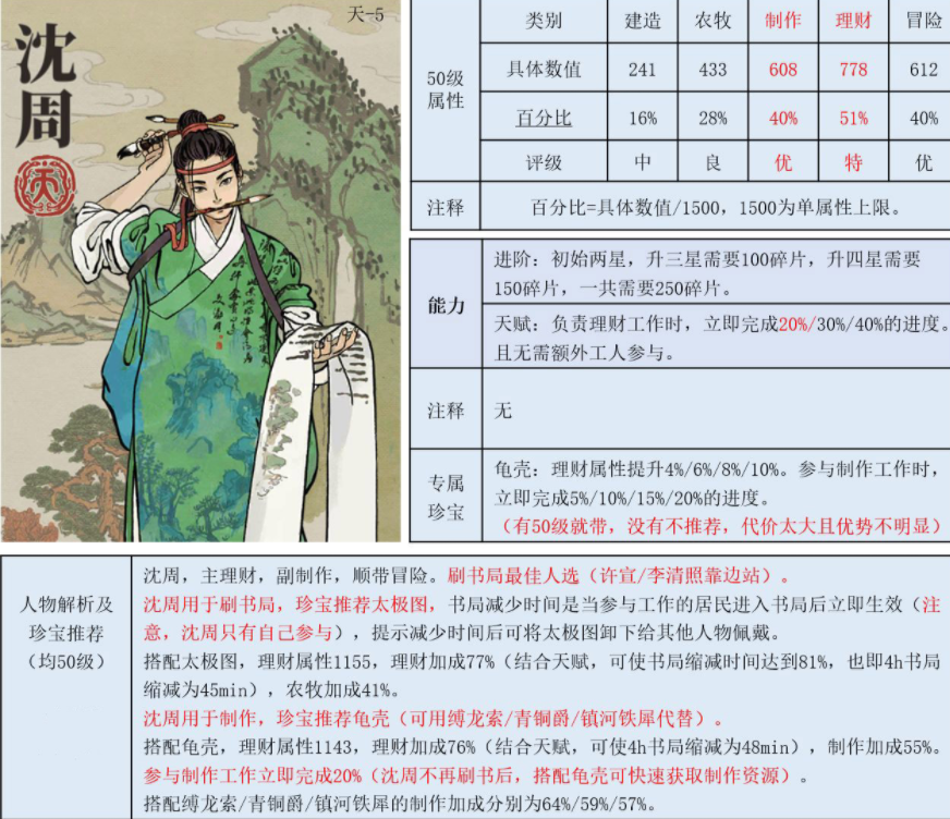 沈周在所有的角色中理财还算不错的,而且制作理财探险方面的属性都更高一些,这个人物主要天赋就是负责理财,所以沈周适合放在书局,或者人多的地方上,而且在搭配满级的太极图,那么理财方面的时间也会减少哦,适合放在书局刷书,还有理财哦。