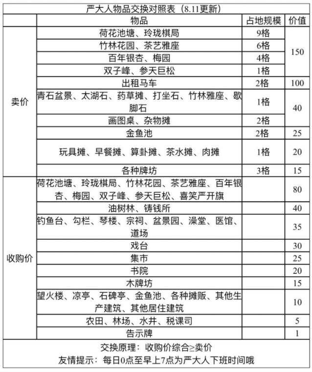 有江湖消息称,严大人在多年的买卖生涯中,形成了自己独有的一套价值交换体系。(以告示牌为例,在严大人的眼中,价值为1,竹林花园价值为150,虽然严大人对于告示牌很是不屑,但如果我们凑够150个告示牌也不是不能商量的)具体见下图。