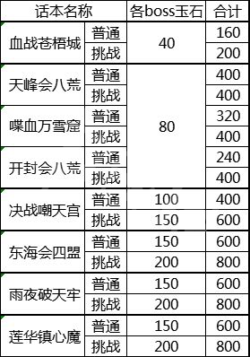 相同话本中不同boss获取的玉石数量相同,击杀单个boss获取的玉石数量基本随话本等级提升有所提升,而东海会四盟、雨夜破天牢、莲华镇心魔这3组话本均为普通本各boss150玉石,挑战本各boss200玉石。