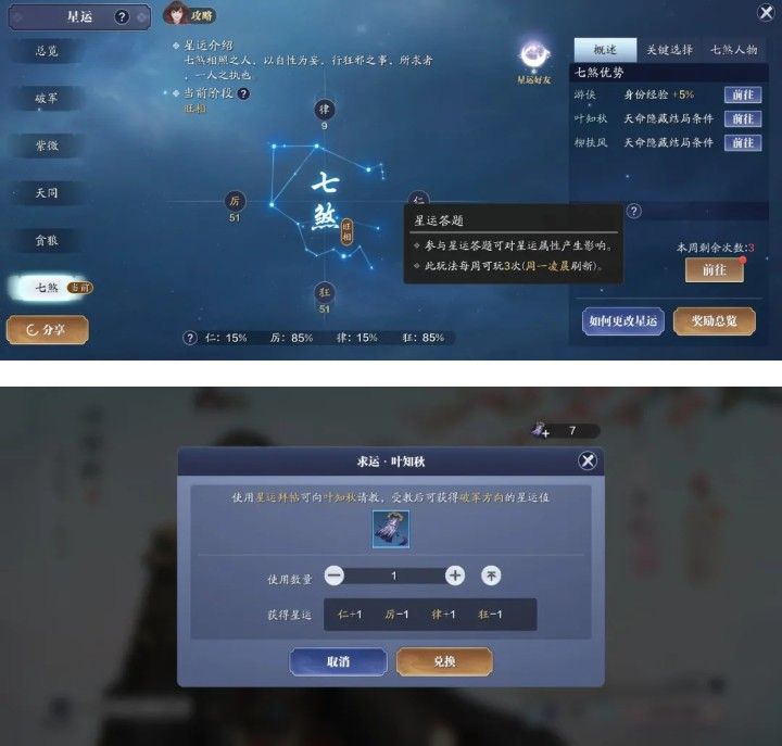 星运不够格的小伙伴可通过星运答题和好感度里的求运,改变自己的星运,大嘴巴百宝箱里都有相关的教程,建议自行模拟(不过这个需要时间,一时半会改变不了);