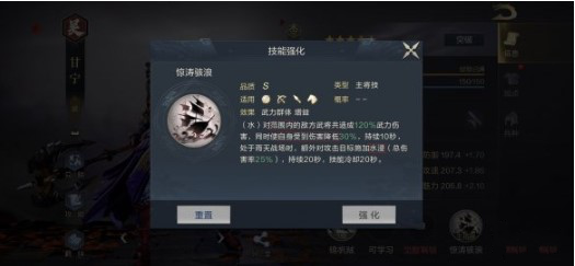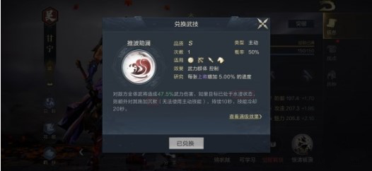 甘宁可以兑换的技能,是S级主动技“推波助澜”,发动概率是50%。当“推波助澜”发动时,甘宁可以对敌方全体武将,造成47.5%的武力伤害。如果目标已经处于水浸状态,则额外对其施加沉默(无法使用主动技能),持续时间长达10秒,技能冷却时间是20秒。