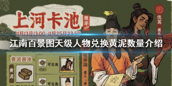 江南百景图天级人物需要多少黄泥才能兑换?江南百景图喜迎新版本更新已经完成,黄泥是新上线的道具,兑换天级人物需要多少黄泥呢,下面小编给大家带来江南百景图天级人物所需黄泥数量介绍,一起来看看吧。