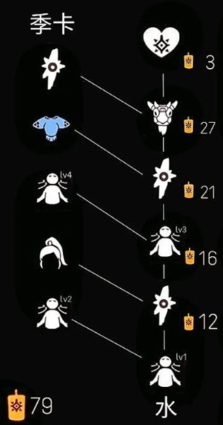 如果想要完成水之先祖的全部兑换,总计需要的蜡烛数量为12+16+21+27+3=79根。