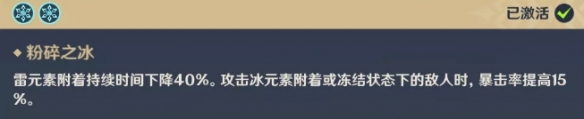 其中「粉碎之冰 」可以在攻击冰元素附着或冻结状态的敌人时获得15%暴击率的正反馈,并减少角色身上40%雷元素持续附着时间,该加成的判定对象是怪物,因此可以给全队吃到暴击率的增益效果,且无关先后手的快照机制。