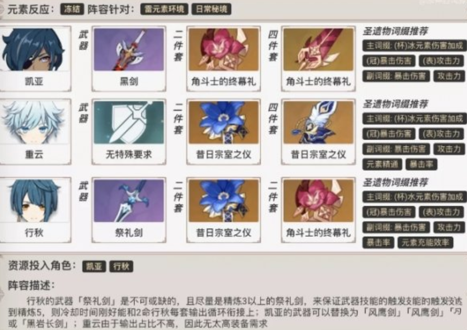 5、切回行秋,在怪物仍处在冻结状态时,连续两次释放元素战技,此时若解锁了第二层命之座效果则仍能享受裁雨留虹持续期间内第四层命之座带来的50%伤害提升。此时共产生8个元素微粒(24能量),借助温迪元素爆发结束回复的15能量,循环中从凯亚和重云的元素战技上可以获得4.8~6能量,只要行秋的元素充能效率达到216%,就可以再次开启元素爆发。而实战中由于怪物血量削减也会产生元素微粒,且祭礼剑的词缀效果同样为元素充能效率(80级55.9%,90级61.3%),因此行秋并不需要特别去堆该项属性值,面板元素充能效率在200%左右即可(如果解锁行秋6命的情况下,可以进一步缩减该数值,只要有高等级祭礼剑就可以)。