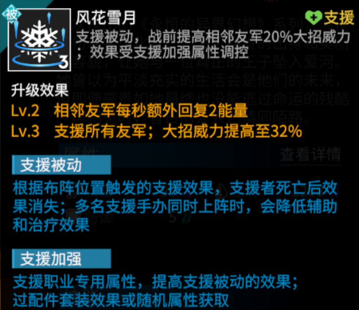 海伦支援被动可以战前提高相邻友军大招威力,适合围绕海伦组建大招流派,其效果受支援加强属性调控。被动升级后,相邻友军每秒额外回能增加,相比大招的瞬间回能可能会能量回复过剩的情况,每秒回能效果更稳定,能进一步提高大招流输出手办的大招启动速度和释放频率。被动升到3级后,可支援所有友军,布阵灵活性大增。