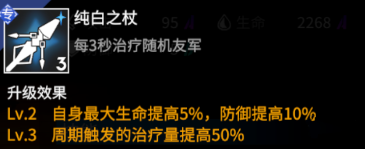 作为支援职业,海伦具有支援专属的职业被动,每数秒治疗随机单体友军,配合大招的群体治疗以多种治疗手段治疗队友。专属额外提供了最大生命和防御,最大生命值可以提高大招和被动的治疗效果,防御则可以提高海伦的生命质量。