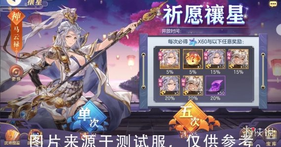 在祈愿禳星活动中,玩家可以选定马云禄或花鬘进行招募,选择的武将会和其他材料一并进行抽取。