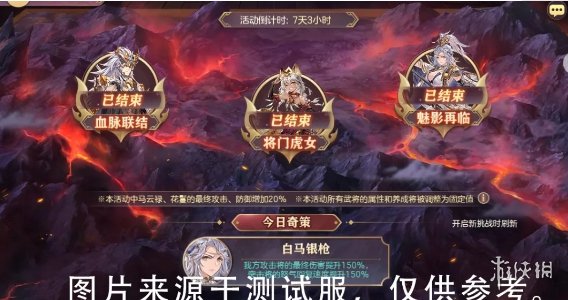 活动期间,活动第1日,第3日,第5日分别开启【血脉联结】、【将门虎女】、【魅影再临】三个阶段的奇策挑战。在本活动中,马云禄、花鬘的最终攻击、最终防御增加20%,并且本活动中所有武将的属性与养成将被调整为固定值。