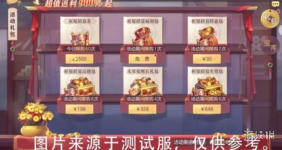 祈愿招募至尊包:内含祈愿招募券*60、元宝*6480,售价648元,活动期间限购6次。
