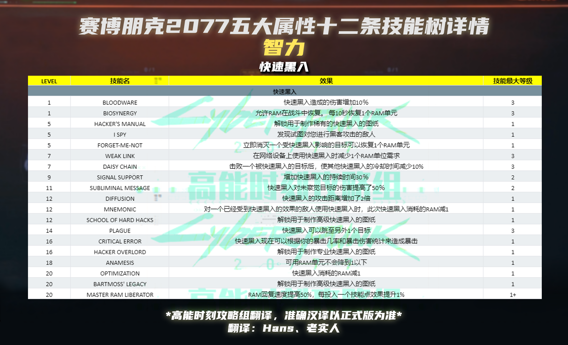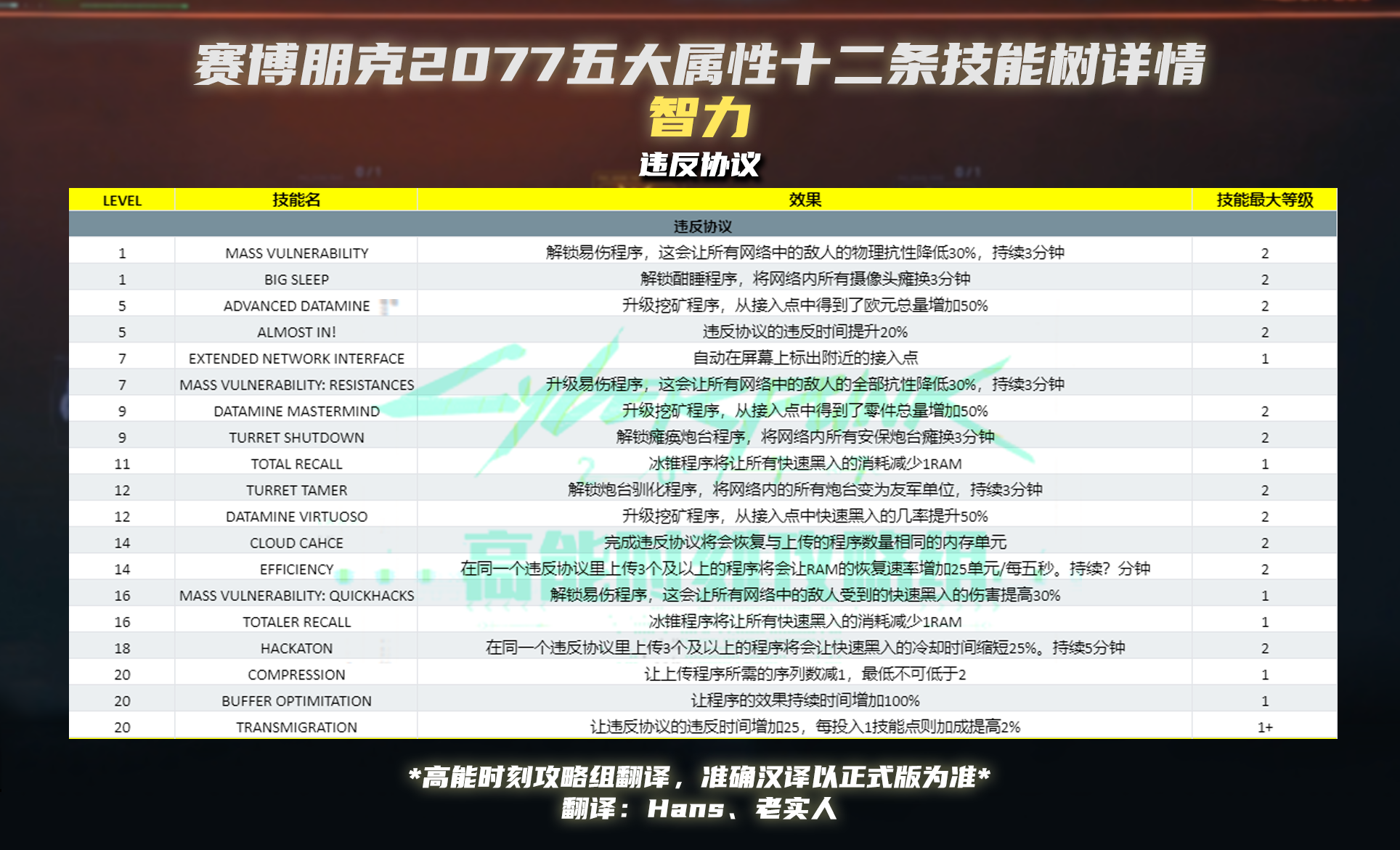 赛博朋克2077智力技能属性效果与等级汇总